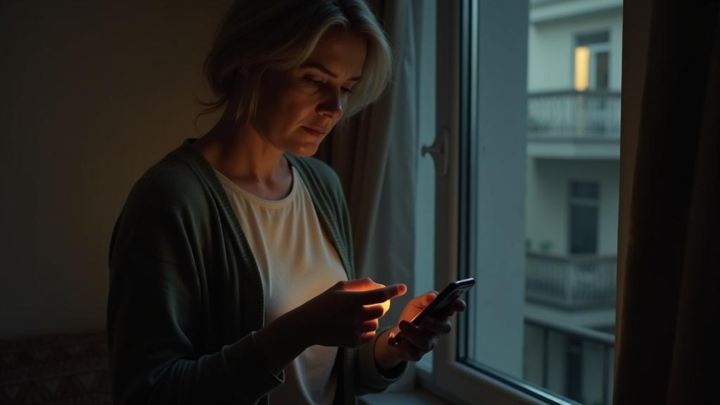 Оксанка стояла у окна, глядя во двор. Дмитрия всё не было — уже девятый час, а он так и не пришёл. Она взяла в руки телефон, чтобы проверить, не написал ли он.
