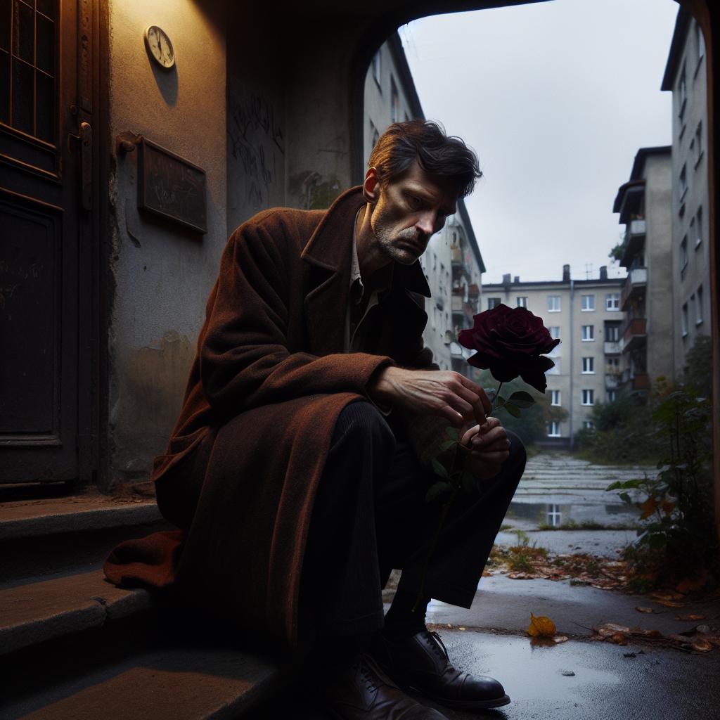 Дмитрий остановился у подъезда, сжимая в ладони тёмно-бордовый бутон. Цветок слегка качнулся, когда сквозняк из приоткрытой двери коснулся его лепестков.