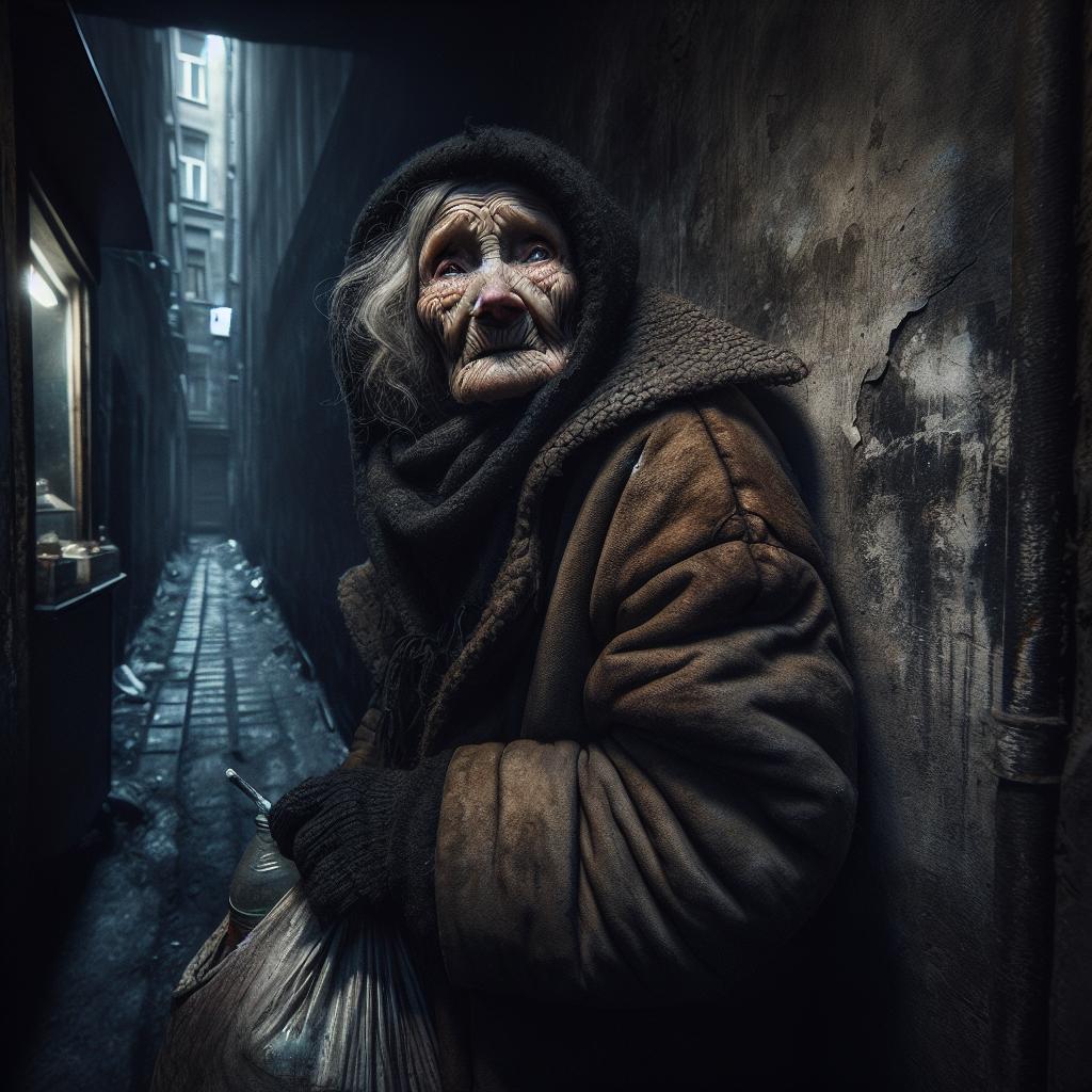 Леденящий зимний ветер пронизывал до самых костей, завывая в узких переулках, словно напоминая о тех временах, когда здесь ещё жили люди с открытыми душами и добрым сердцем. У облупившейся стены под выцветшей вывеской стояла старушка — лицо её было испещрено морщинами, каждая из которых будто хранила воспоминания о боли, стойкости и несбывшихся мечтах. В руках она крепко держала поношенную сумку с пустыми бутылками — остатками от прежней жизни. Из глаз текли слёзы, застывая на щеках от мороза.