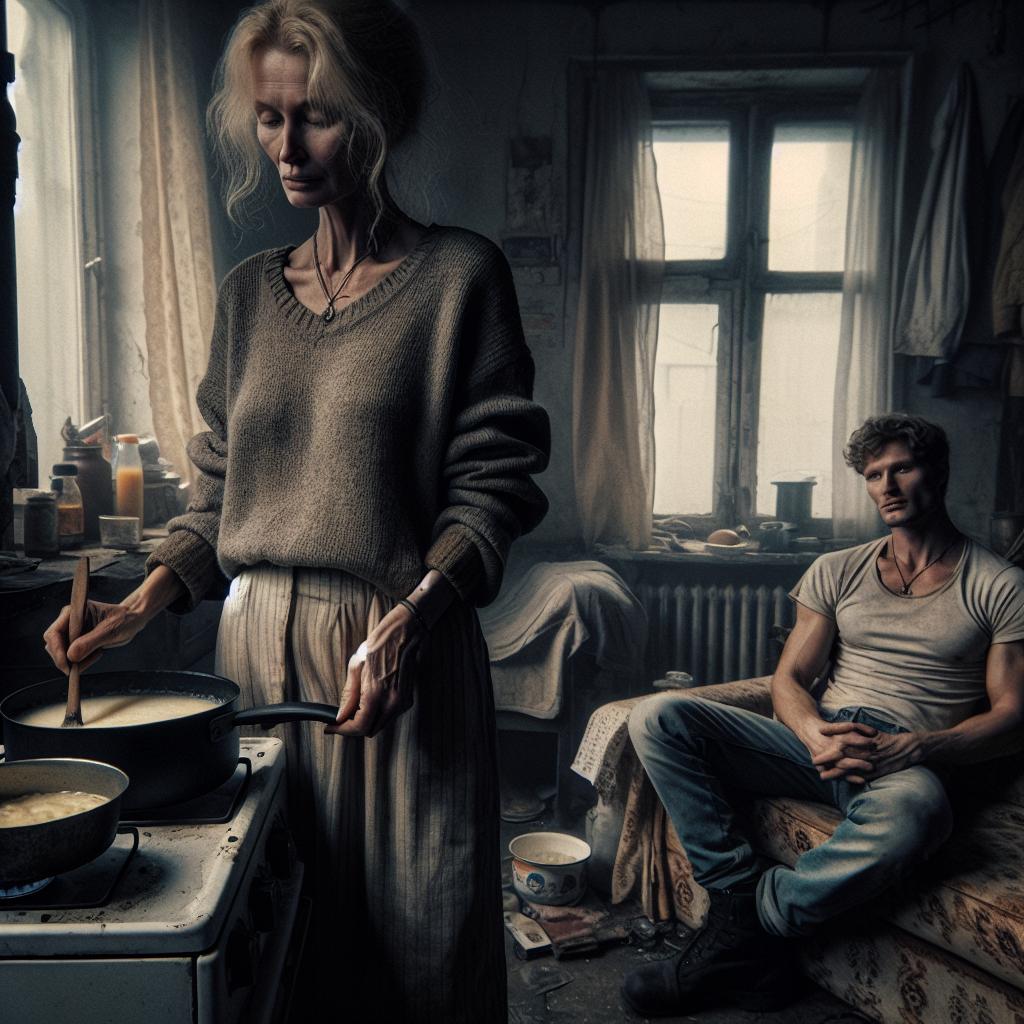 Оксана молча мешала кашу в кастрюле. За окном моросил осенний дождь. Капли медленно стекали по стеклу их съёмной студии на окраине города.