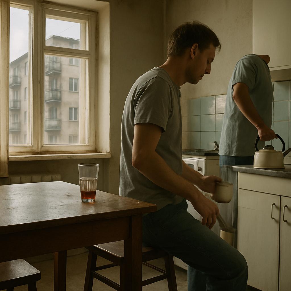 Денис сидел за кухонным столом, безучастно глядя в пустую стену напротив. Там не было ничего, что могло бы отвлечь или дать ответы на накопившиеся вопросы. Он тяжело вздохнул и с отвращением посмотрел на остывший чай в стакане — жидкий, почти прозрачный, заварка из него была выжата до предела. Больше чая не оставалось, как и средств, чтобы его купить. Денис поднялся, вылил остатки в раковину, сполоснул стакан, налил немного ещё тёплой воды из чайника и залпом выпил.
