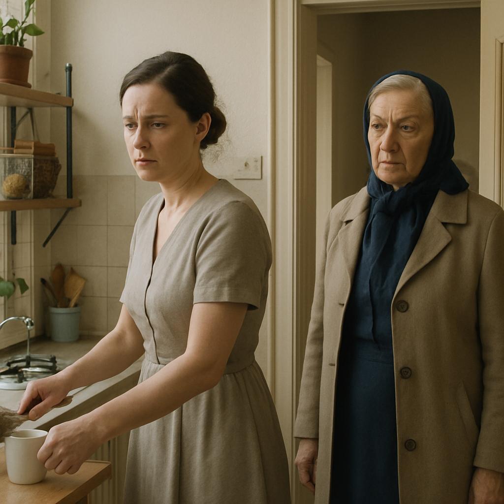 Гостья вошла в квартиру, внимательно осмотрев прихожую. На ней был светлый плащ и тёмно-синий платок, завязанный под подбородком по старинке.