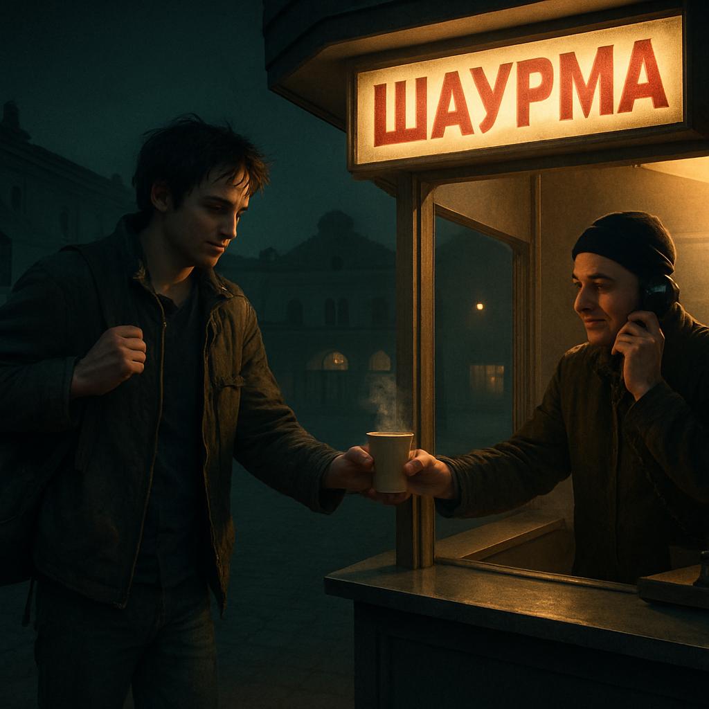 Богдан вышел из электрички. Сквозь темноту ночи едва угадывались очертания вокзального здания. На пустынной площади перед вокзалом одиноко мерцал свет в окошке шаурменной. Перекинув рюкзак на плечо, Богдан направился к торговому киоску, где приобрёл шаурму, а заодно получил от добродушного продавца горячий чай и лепёшку в придачу.