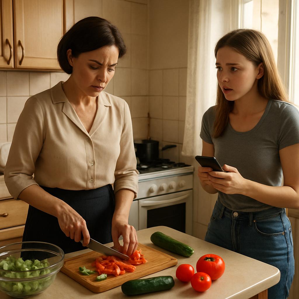 Я нарезала овощи для салата, когда на кухню вошла моя дочь Екатерина. Лицо у неё было напряжённое, взгляд — отведён в сторону, а в руках она нервно крутила телефон.