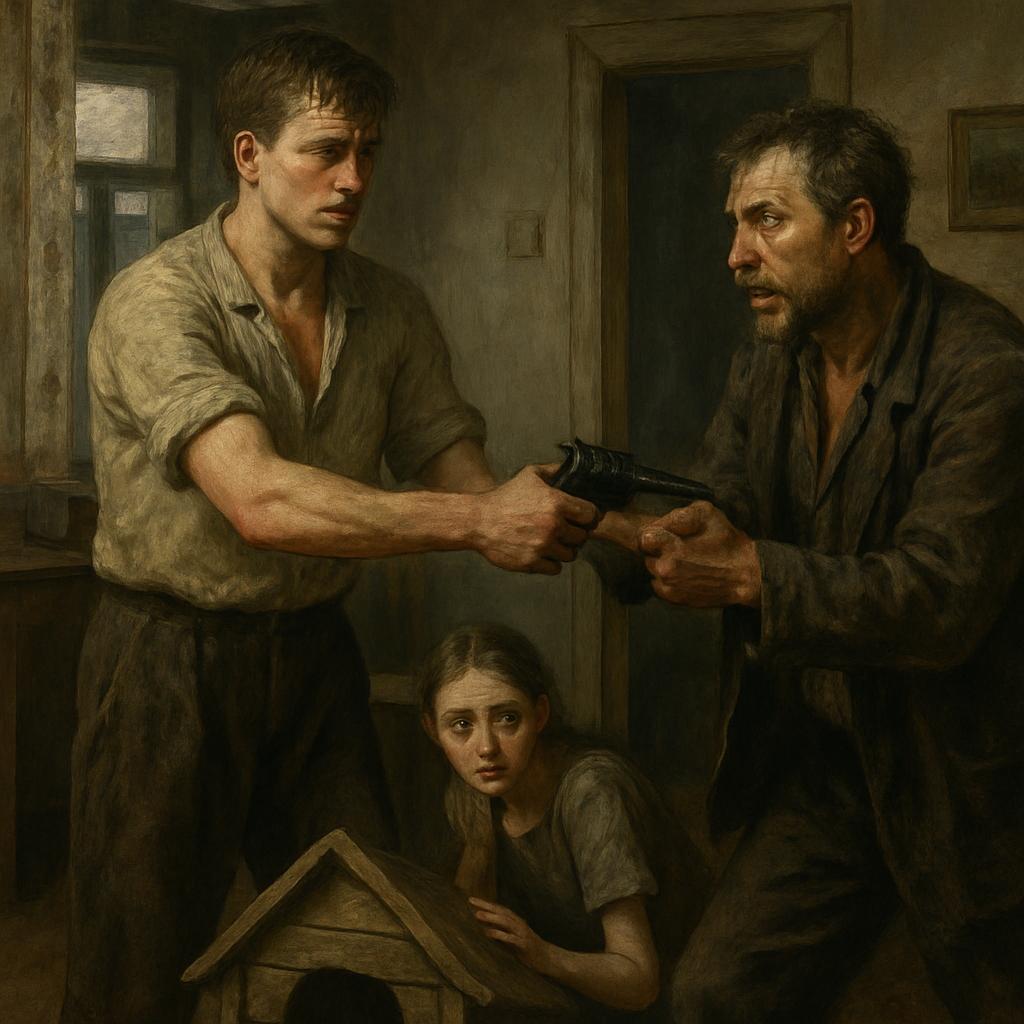 Домик у него стоял скромный: невысокий заборчик и калитка закрыта. Богдан слегка толкнул её плечом — та отворилась без сопротивления. Во дворе же раздавались крики и всхлипы… И вот перед ним предстала такая сцена: его бывший одноклассник Юрий стоял пошатываясь с ружьём в руках, а рядом возле собачьей будки на четвереньках дрожала молоденькая девушка.