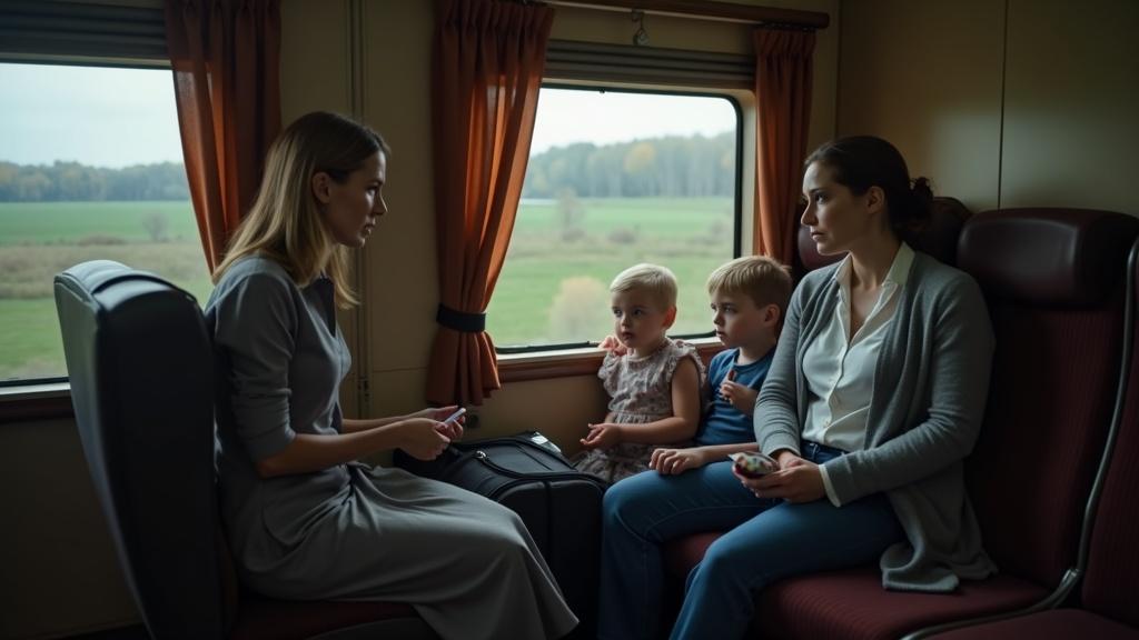 — Проездные, пожалуйста, — в купе заглянула проводница и ловко опустилась на нижнюю полку. В руках у неё была кожаная папка с билетами пассажиров. Она профессионально улыбнулась, но взгляд задержался на Оксане с детьми.