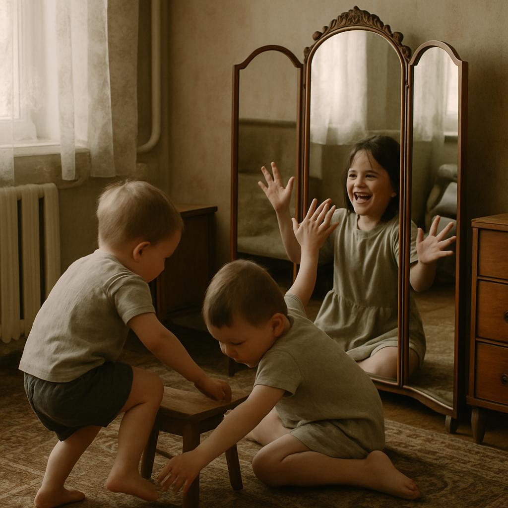 В родительском доме с давних времён стоял трельяж — центральное зеркало было неподвижным, а по бокам располагались две подвижные створки. Мы с братом обожали забираться на тумбу с ногами, сводить боковые зеркала и наблюдать бесконечные отражения в зеркальном коридоре. Порой мы толкались, стараясь занять место первым, но чаще устраивались вдвоём и корчили рожицы, заливаясь смехом.