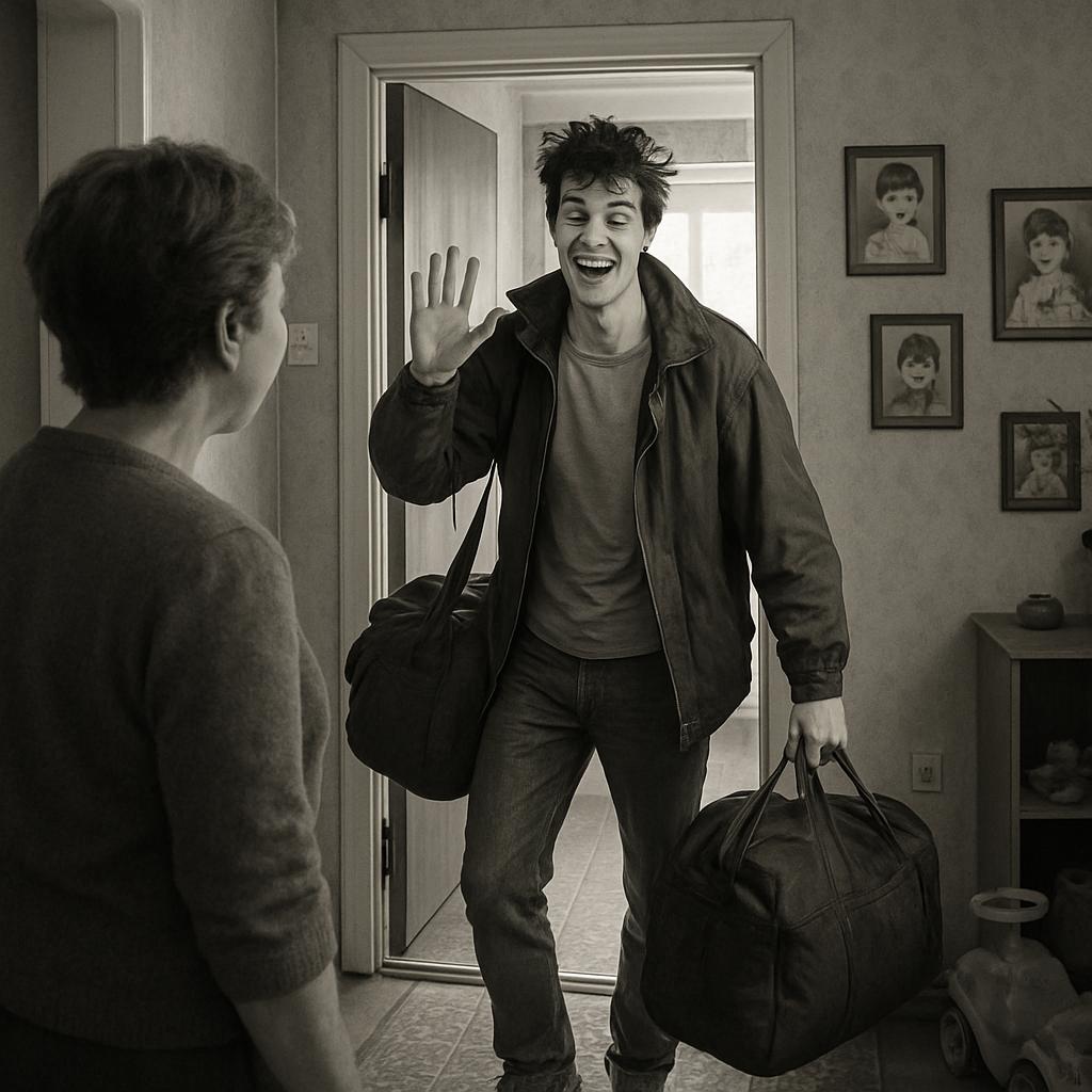 Лариса застыла в дверях, с удивлением глядя на племянника. Он стоял на пороге с двумя огромными сумками, из которых торчали учебники и свернутое одеяло. На лице сияла широкая улыбка, волосы взъерошены, куртка распахнута — типичный студент, уверенный в своей привлекательности.