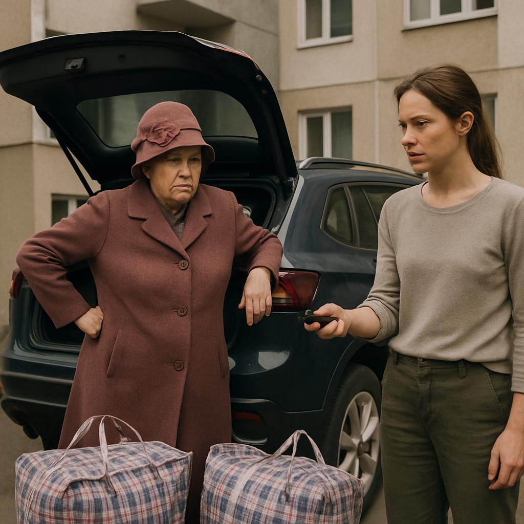 Лариса стояла у задней части новенького тёмно-синего кроссовера, опираясь локтем на крышку багажника с видом полноправной хозяйки. На ней было пальто неясного оттенка — что-то между «пыльной розой» и «увядшей свеклой», а на голове — шляпка с фетровым цветком, нависавшим над левым глазом почти угрожающе. Рядом на асфальте громоздились три клетчатые сумки, набитые чем-то тяжёлым и угловатым.
