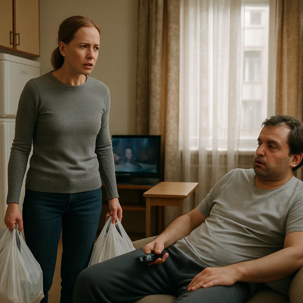 Оксана застыла у холодильника, держа в руках пакеты. Антон развалился на диване, не удостоив её взглядом — он продолжал смотреть передачу о колебаниях валютных курсов. На журнальном столике перед ним стояла тарелка с наполовину съеденными магазинными пельменями.