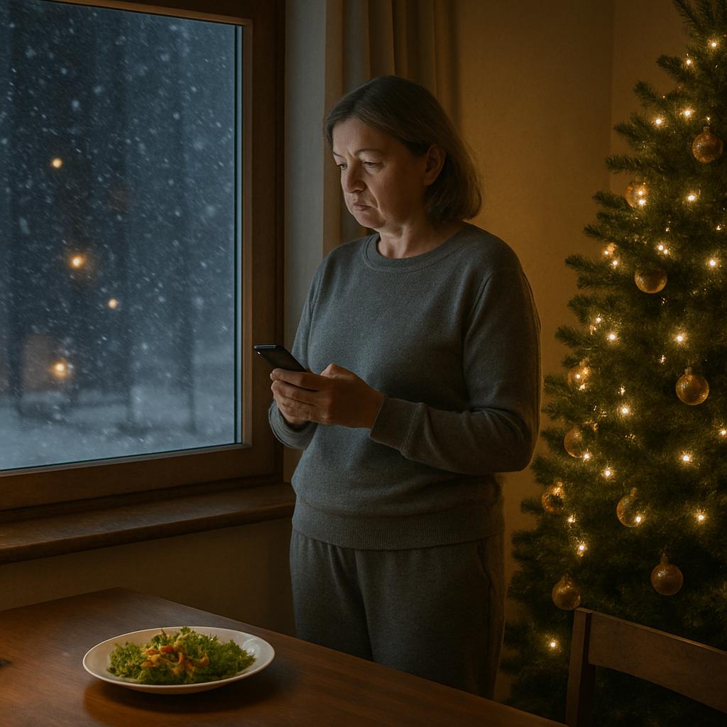 На столе — тарелка с оливье. Всего одна. Один бокал, одна салфетка. Я приготовила салат по маминому рецепту — с солёными огурцами вместо маринованных, как это делали в девяностые годы. Почему? Наверное, из-за привычки. Или из желания хоть немного приблизить ощущение праздника.