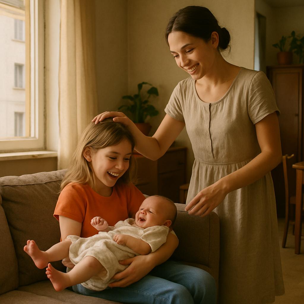 — Конечно тебе, — мягко ответила она, подойдя ближе и ласково пригладив старшую по растрёпанным волосам. — Ты же у нас главный весельчак для малышки.