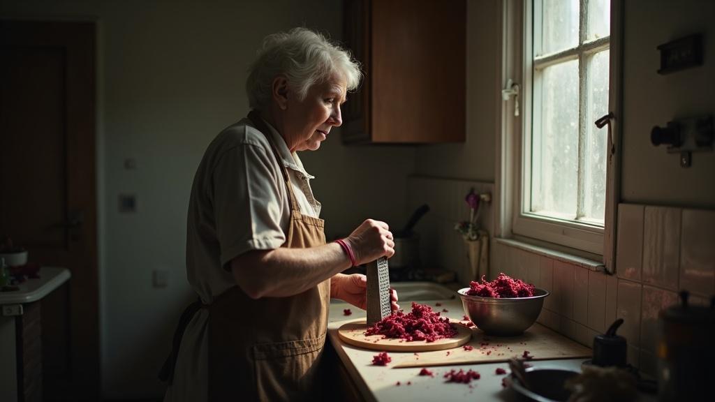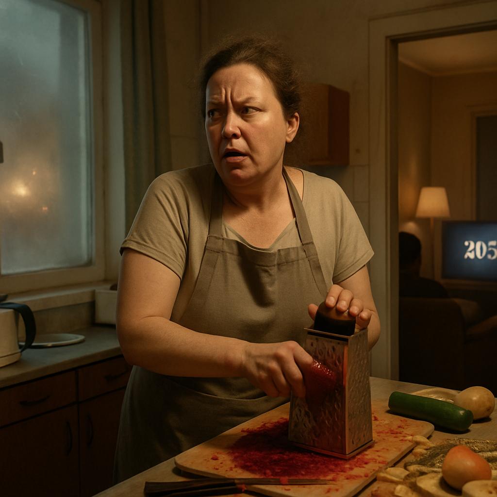 Голос Богдана донёсся из гостиной, приглушённый, будто он говорил сквозь подушку. Ганна застыла с тёркой в руке. Свекольный сок медленно стекал по запястью, огибая старенькие часы на кожаном ремешке. На столе царил беспорядок: картофельные очистки, шелуха от лука, открытая банка зелёного горошка — словно крошечный кратер посреди хаоса.