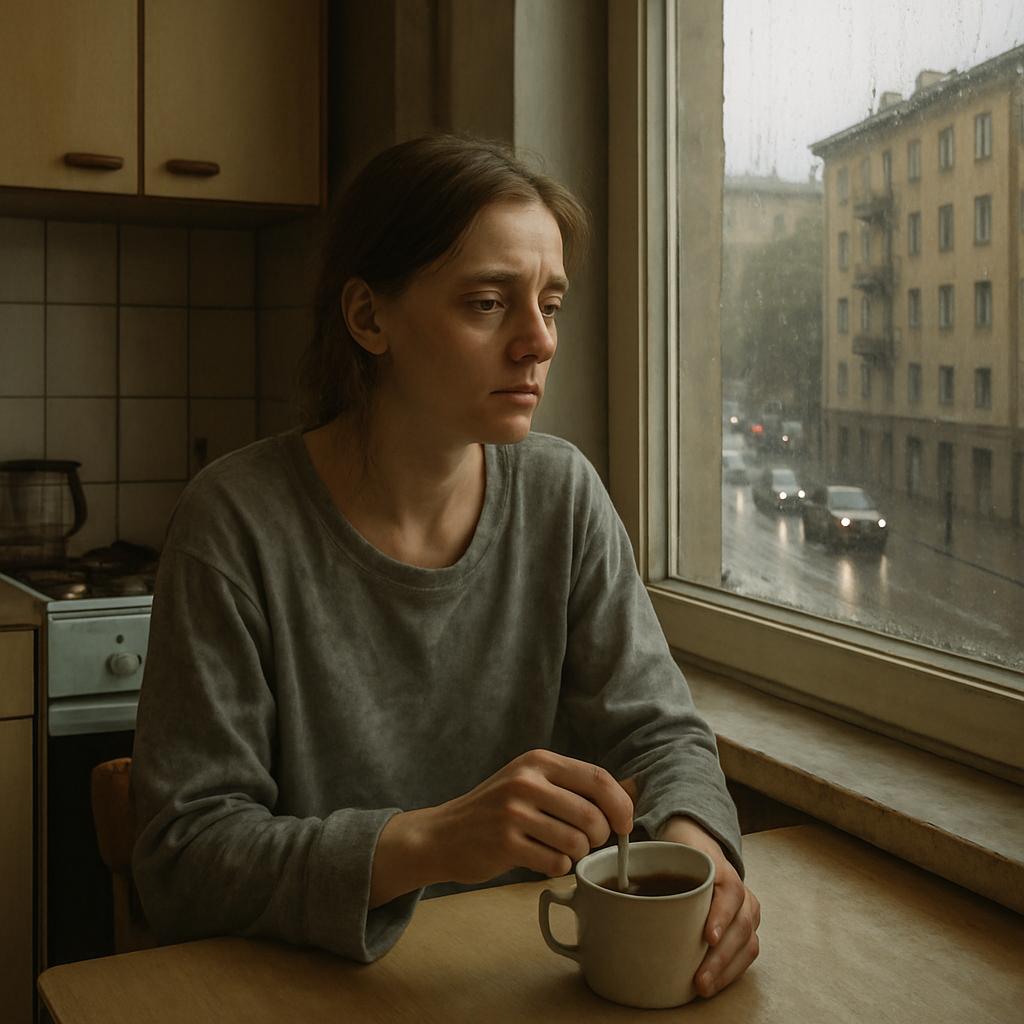 Оксана сидела на кухне, медленно размешивая остывший чай, и смотрела в окно. За стеклом моросил дождь, внизу по дороге тянулись вереницы машин, а прохожие торопились домой после рабочего дня.