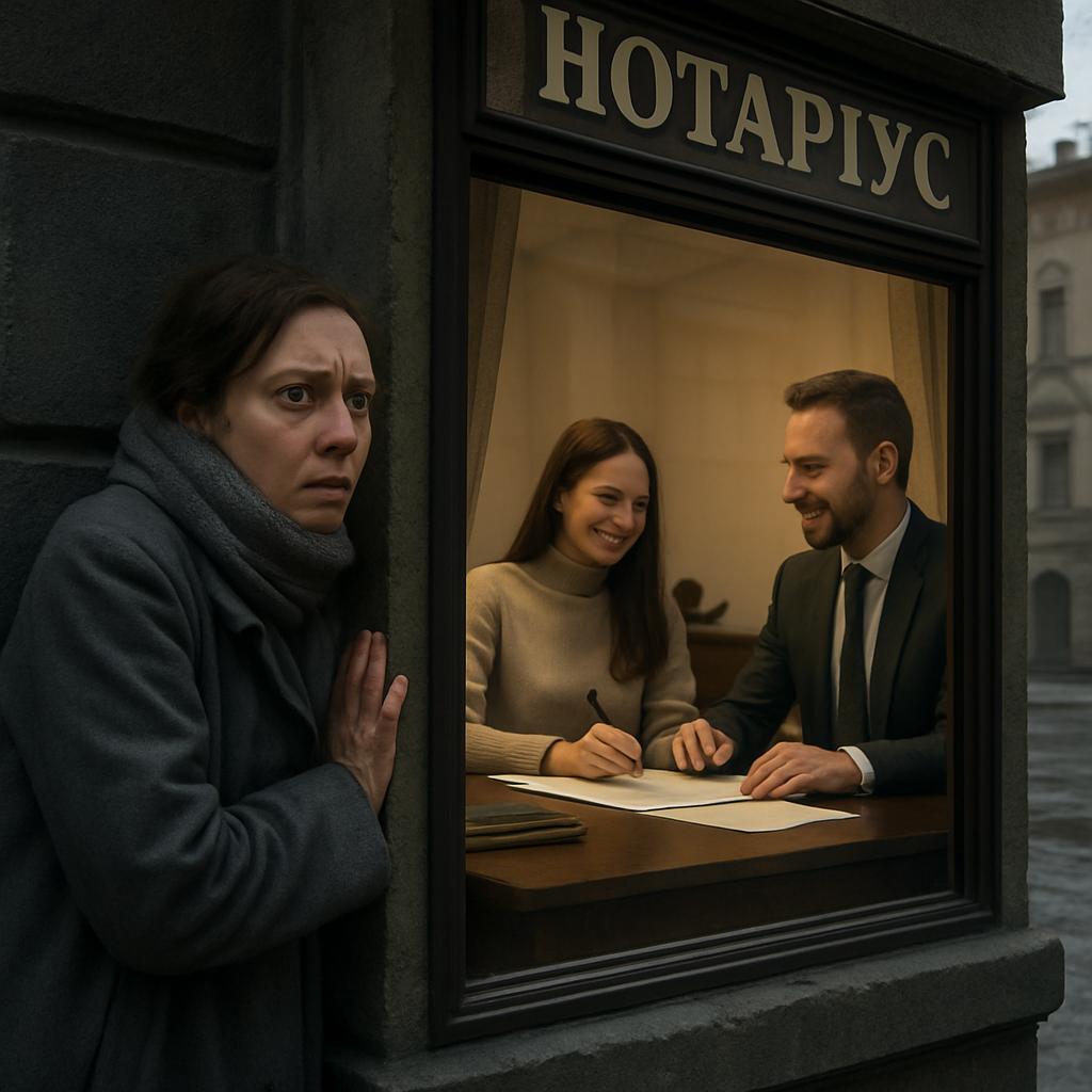 Леся отступила от двери и прижалась спиной к холодной стене здания. Сердце колотилось так сильно, что казалось — его стук слышен на всю улицу. В голове крутилась одна мысль: зачем им нотариус? И почему всё это происходит за её спиной?