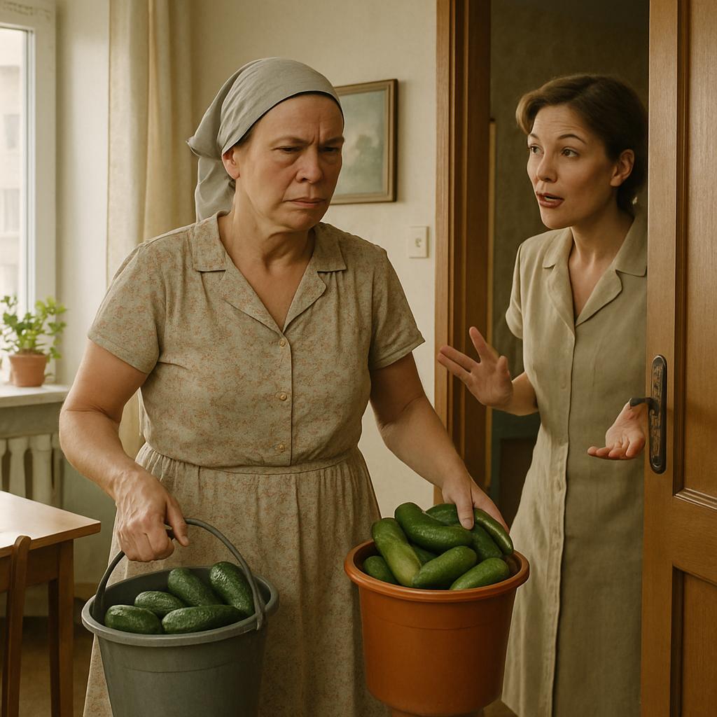 Оксана в этот раз вышла не просто с одним ведром — а сразу с двумя. В одной руке у неё огурцы, в другой — кабачки, а на голове — платок, повязанный так, что уши торчат наружу. На лице читается выражение: «подойди — пожалеешь». Но к забору уже тянется Любовь, словно подсолнух к солнцу, только вместо семечек у неё — просьбы.