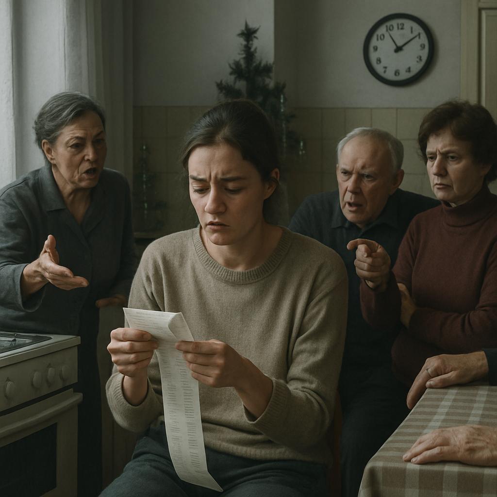Третье января выдалось хмурым и пронизывающе холодным. Новогодние украшения, еще недавно казавшиеся сказочными, теперь выглядели как пестрое напоминание о пустом кошельке. Оксана сидела на кухне у свекрови, Галины, и нервно теребила в пальцах длинный чек из супермаркета — тот тянулся почти как зимняя ночь.