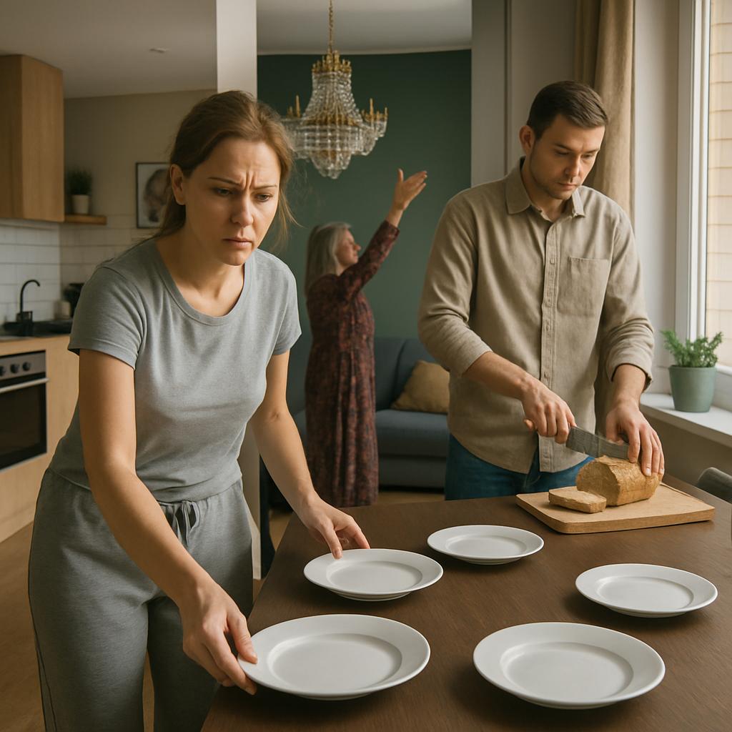 Богдан, нарезавший хлеб на кухне, сжал нож так крепко, будто собирался его переломить. Жена подошла к нему, слегка коснулась плеча и покачала головой — молча напоминая: не стоит. Он шумно вдохнул и кивнул в ответ, но напряжение в его фигуре осталось.