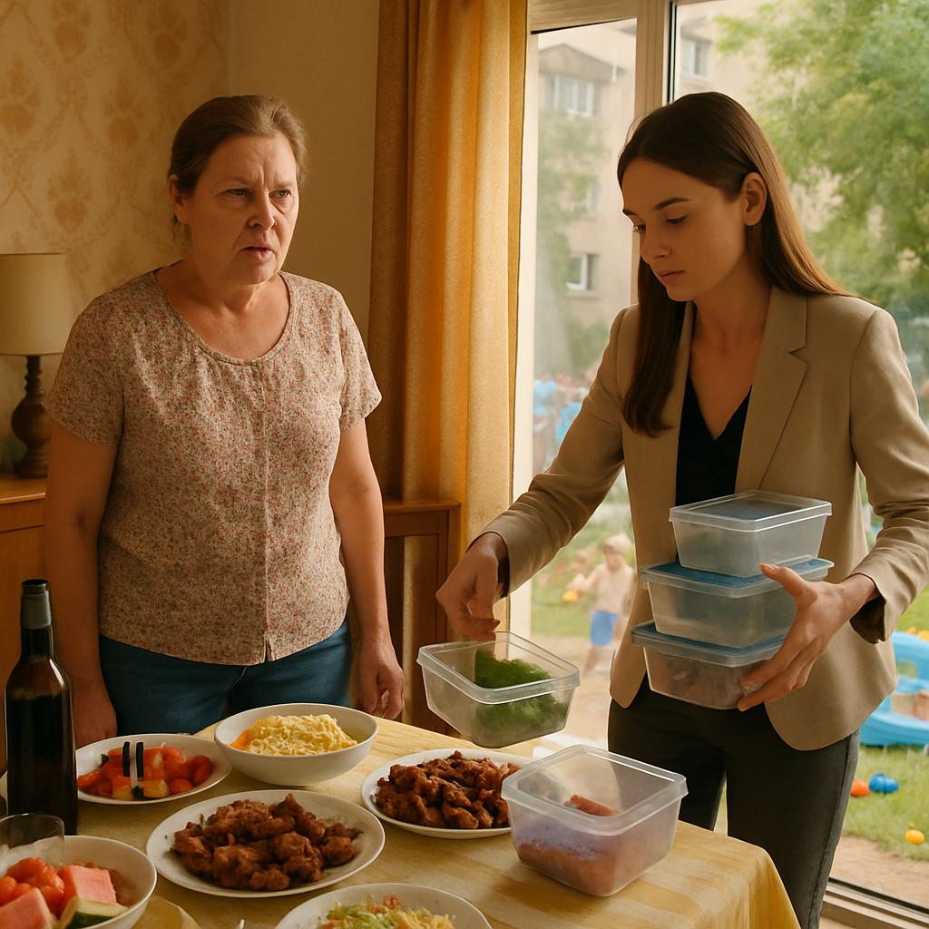Себе тоже оставила немного барбекю — чтобы не стоять у плиты на следующий день. Мы не планировали ночевать на даче: вечером собирались возвращаться домой. Поэтому всё упаковала заблаговременно: два контейнера с мясом и один с салатом. Подписала аккуратно и отставила в сторону.