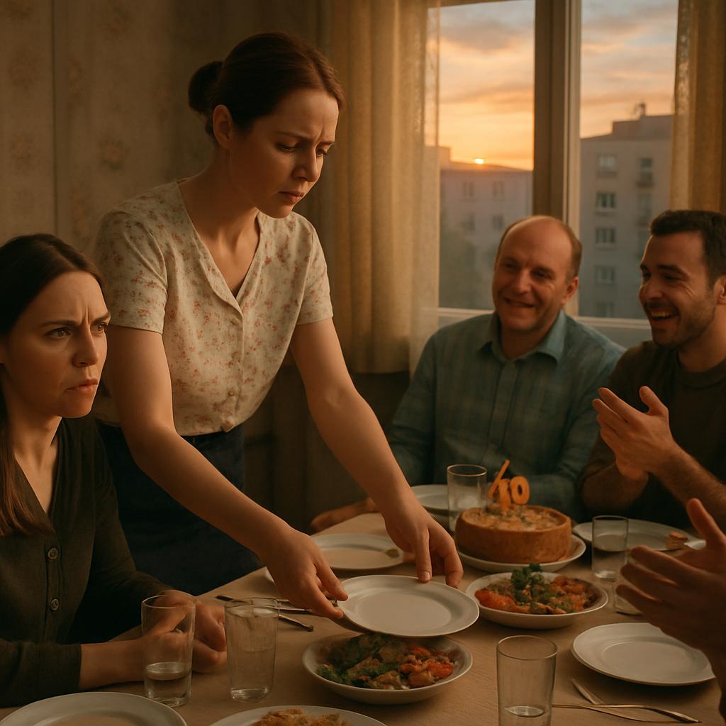 Оксана, державшая в руках стопку чистых тарелок у серванта, застыла на месте. Внутри у неё всё сжалось в тугой комок. Сегодня был юбилей её мужа — Александру исполнилось сорок. Она готовилась к этому дню две недели: продумывала меню до мелочей, закупала продукты на рынке, выбирая только лучшее и свежее, мариновала мясо по особому рецепту, который выпросила у шеф-повара на корпоративе. Вчера она провела у плиты семь часов подряд — ни минуты не присев — чтобы всё получилось идеально. И вот гости только расселись за столом, даже первый тост ещё не прозвучал, а Лариса уже начала свою привычную критику.