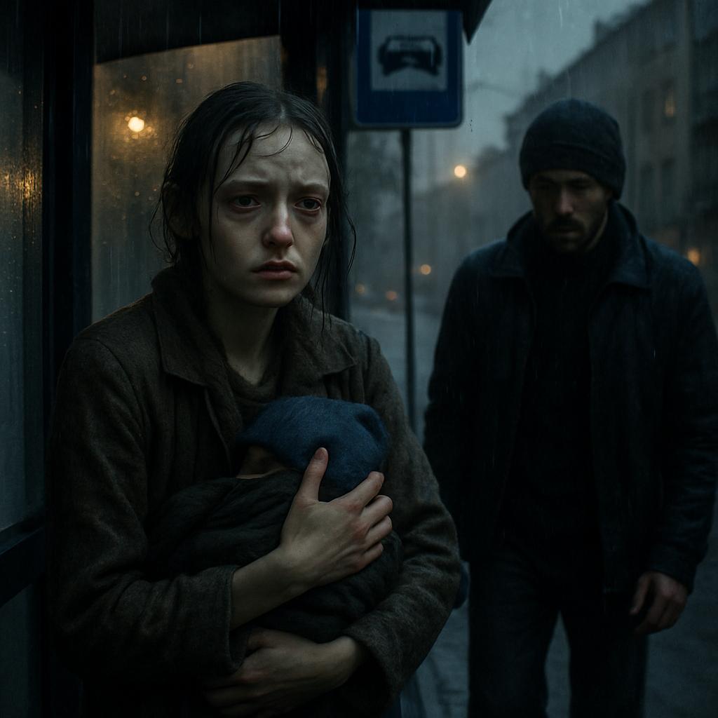 Сквозь пелену дождя показалась остановка — облупленная, с разбитым стеклом. У стены стояла девушка, промокшая до нитки. В руках она держала свёрток, из которого выглядывал край детской шапочки. Под глазом — старый синяк с зеленовато-жёлтым оттенком.