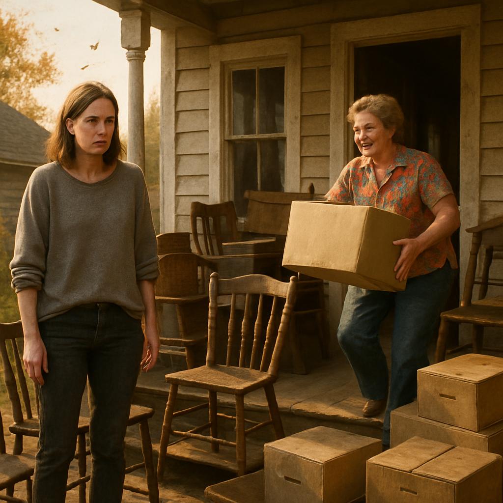 Они оба застынули, глядя на крыльцо, заваленное коробками, мешками и какими-то странными узлами — словно сюда тайком переселился филиал музея народного быта. Над этим хаосом возвышалась старая табуретка с трещиной в ножке — как будто это был трон давно забытого правителя.
