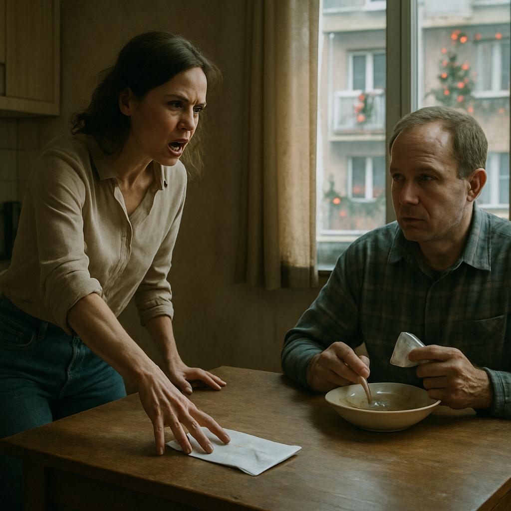 Алексей, сидевший над тарелкой вчерашнего супа в своей привычной выцветшей фланелевой рубашке, даже не шелохнулся. Он неспешно отложил ложку, промокнул губы бумажной салфеткой и только после этого поднял глаза на жену.