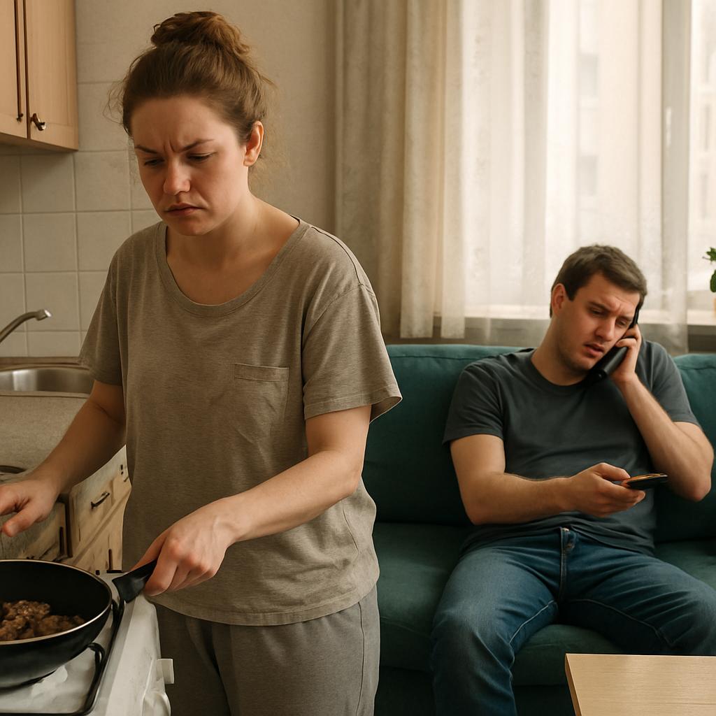 В это время Оксана находилась на кухне у плиты: мясо шкворчало на сковороде, а она сосредоточенно следила за процессом.