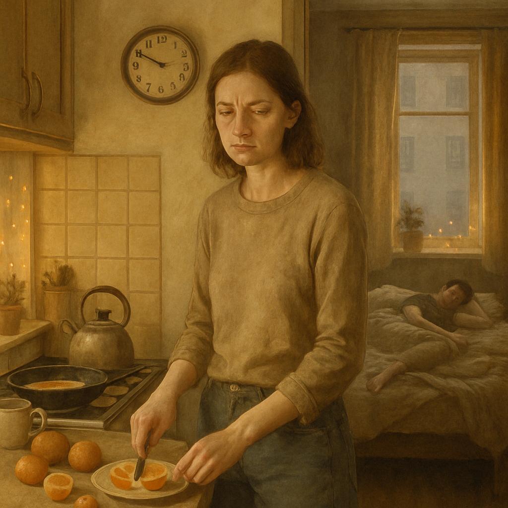 Я проснулась раньше сигнала будильника — в воздухе витал аромат мандаринов. Их накануне принесли коллеги, и я высыпала весь пакет прямо в хрустальную вазу — ту самую, что когда-то подарила свекровь. На кухне негромко тикали часы, гирлянды на подоконнике мерцали мягким светом, батареи тихо потрескивали от жары. Богдан раскинулся поперёк кровати, дышал шумно и прерывисто, будто мир задолжал ему покой.