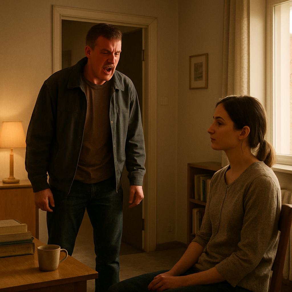 Он шагнул вперёд и оказался под светом торшера. Его лицо теперь было видно отчётливо: напряжённые скулы, плотно сжатые губы. Он бросил куртку на кресло — резко, почти с вызовом.
