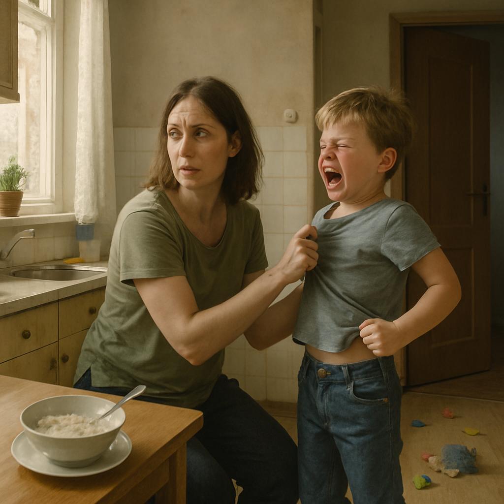 Семилетний Марк, ещё не проснувшийся окончательно и капризный, сопротивлялся изо всех сил, когда она пыталась надеть на него школьные брюки. С трудом справившись с этой задачей, она повела упрямого сына на кухню.
