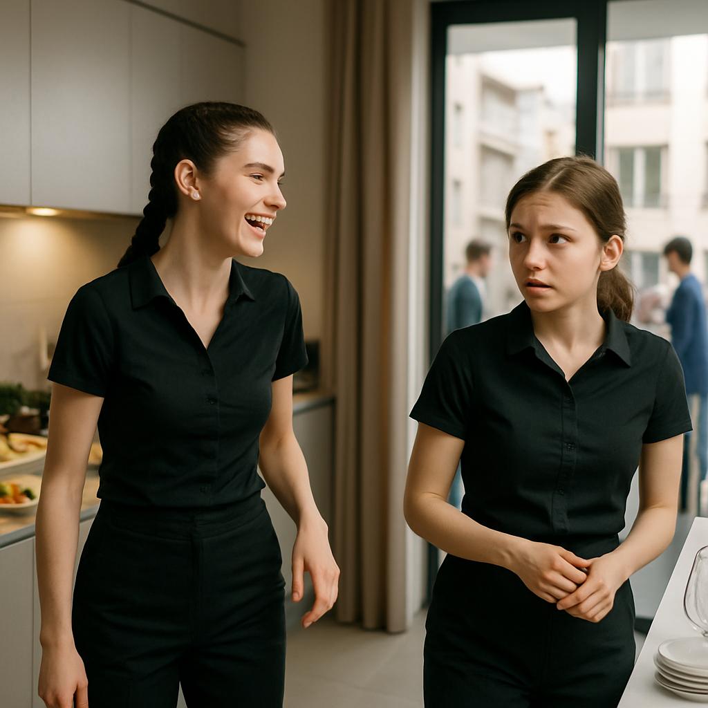 Среди всех работников на банкете особенно выделялась Оксана Петрик: высокая, всегда улыбается, волосы убраны в длинную косу, а форма только подчёркивала её стройность.