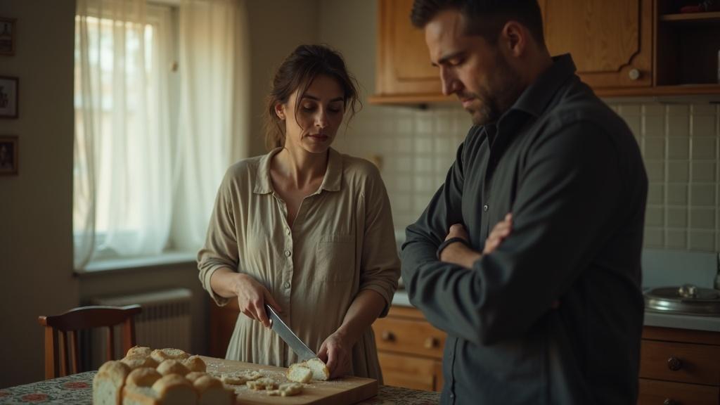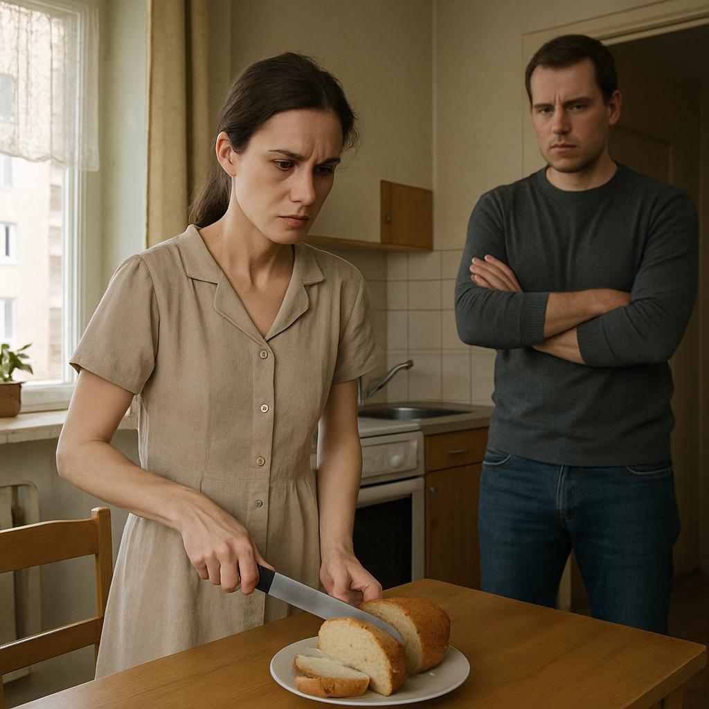 — Мария, ну кто же так нарезает хлеб? Я ведь тебе уже сто раз объяснял: нож нужно держать под углом, а не класть плашмя! Смотри — край весь изрезан, как будто его грызли мыши. Ты вообще способна хоть что-то сделать нормально?