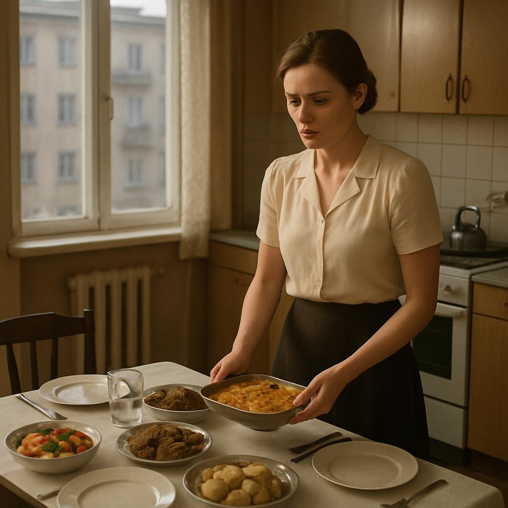 Ганна сидела с прямой спиной. Перед ней оставалась пустая тарелка. Она отломила кусочек хлеба, налила компот — и на этом всё.