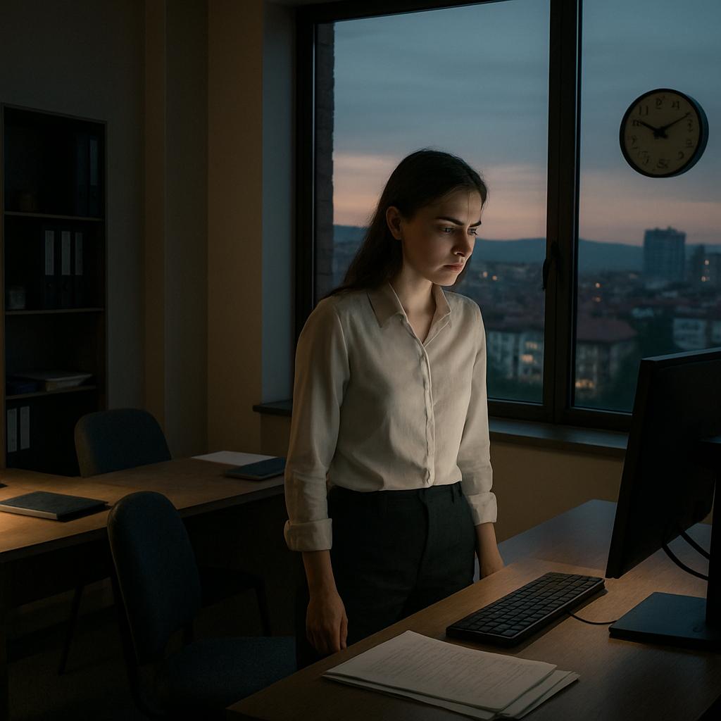 Оксана стояла у офисного окна и наблюдала, как за стеклом постепенно сгущаются сумерки. На часах было уже половина десятого. Сотрудники разошлись ещё пару часов назад, лишь уборщица время от времени появлялась в коридоре со шваброй. А Оксана по‑прежнему не отрывалась от монитора, дописывая последний раздел отчёта по проекту.