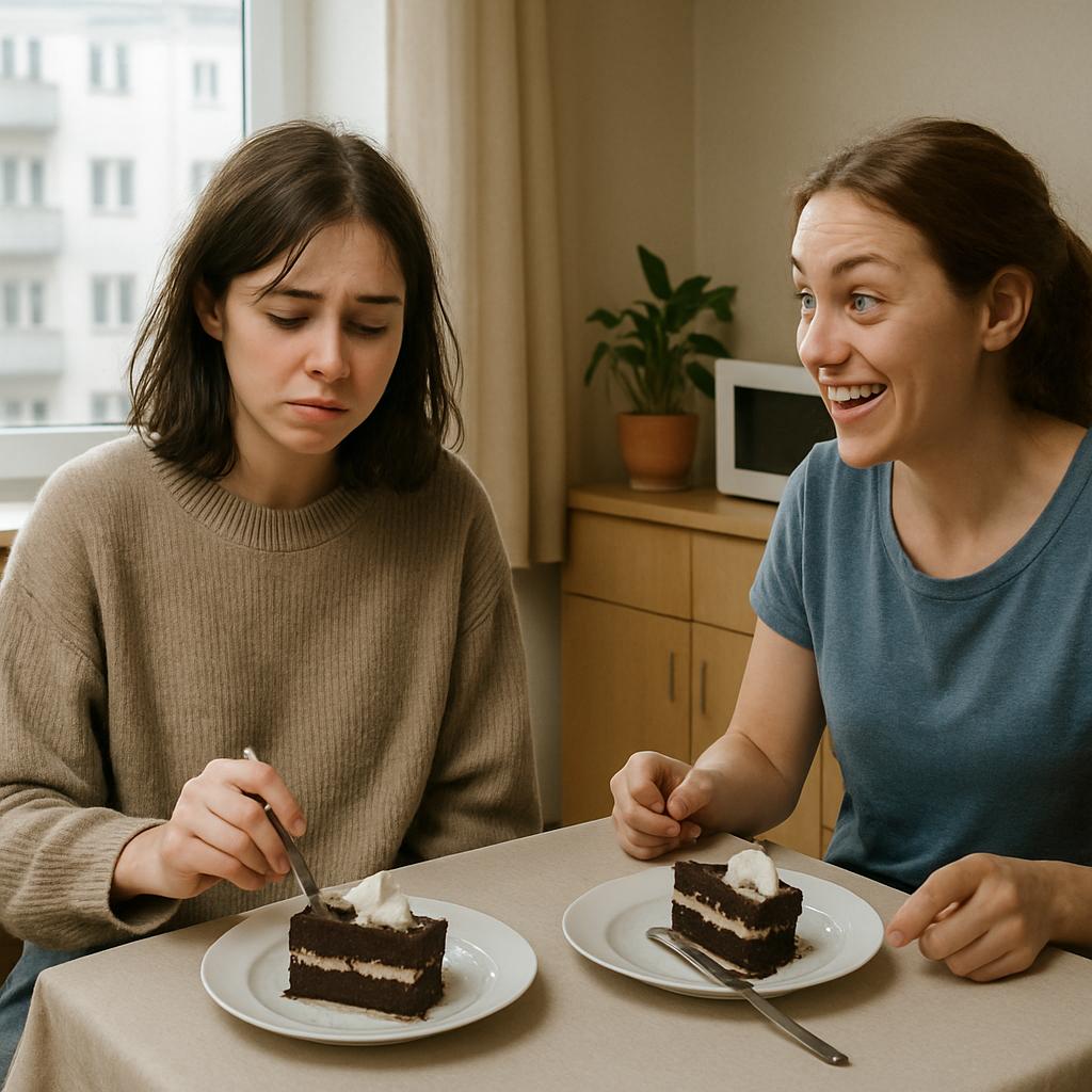 – Леся, я уже объелась, больше не могу. Доешь мой тортик? – с усмешкой произнесла подруга.
