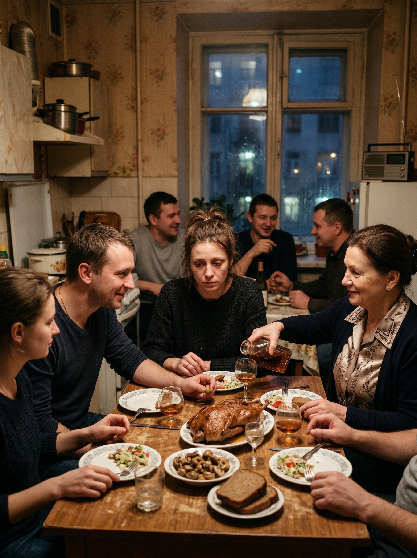 Аромат запечённой утки, смешанный с пряным запахом маринованных грибов, висел в комнате плотной завесой. Стекло звенело о стекло, гости перекрикивали друг друга, смех вспыхивал то тут, то там — типичный субботний сбор у свекрови. Галина Павловна, торжественно разливая коньяк по рюмкам, буквально светилась от удовольствия. Её праздник, её дом, её правила.