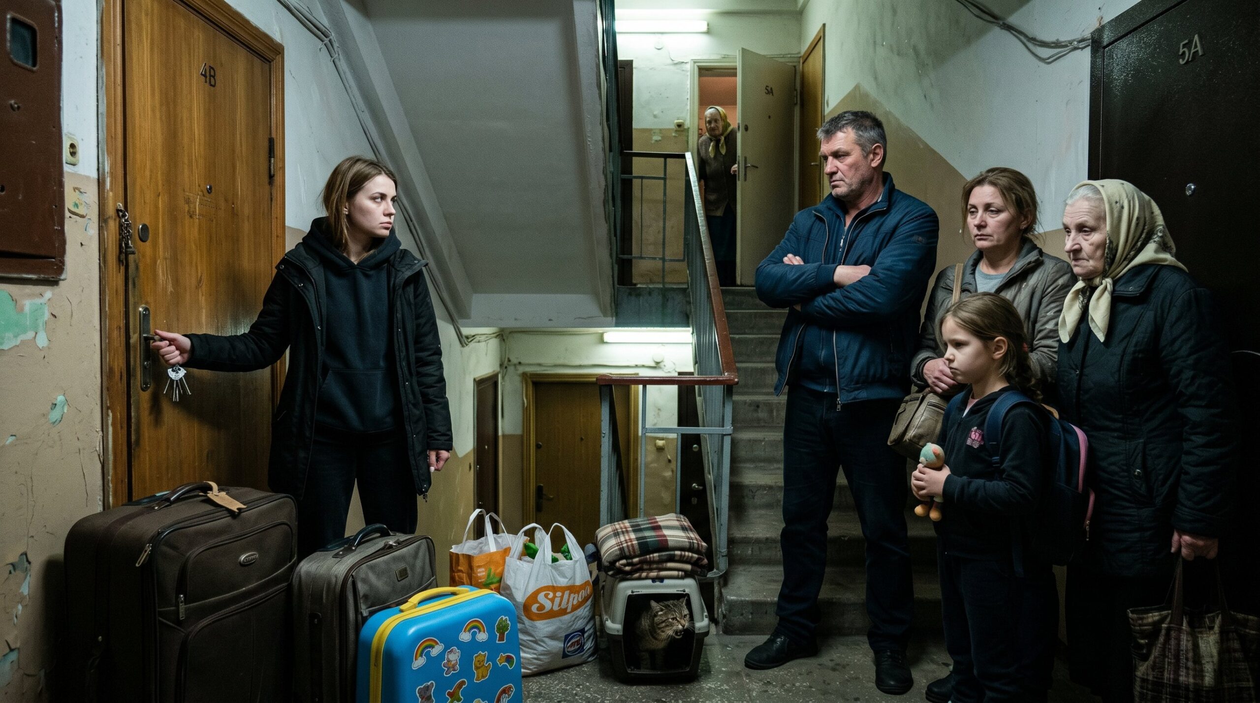 Он стоял впереди — высокий, широкоплечий, куртка распахнута. За его спиной виднелась Тетяна, сестра покойного мужа Оксаны, с выражением усталой решимости на лице, будто она уже измотана чужим упрямством, хотя разговор ещё толком не начался. Чуть поодаль — их восьмилетняя дочь София, сонная, насупленная. Последней, опираясь на дорожную сумку, стояла Галина — мать Александра.