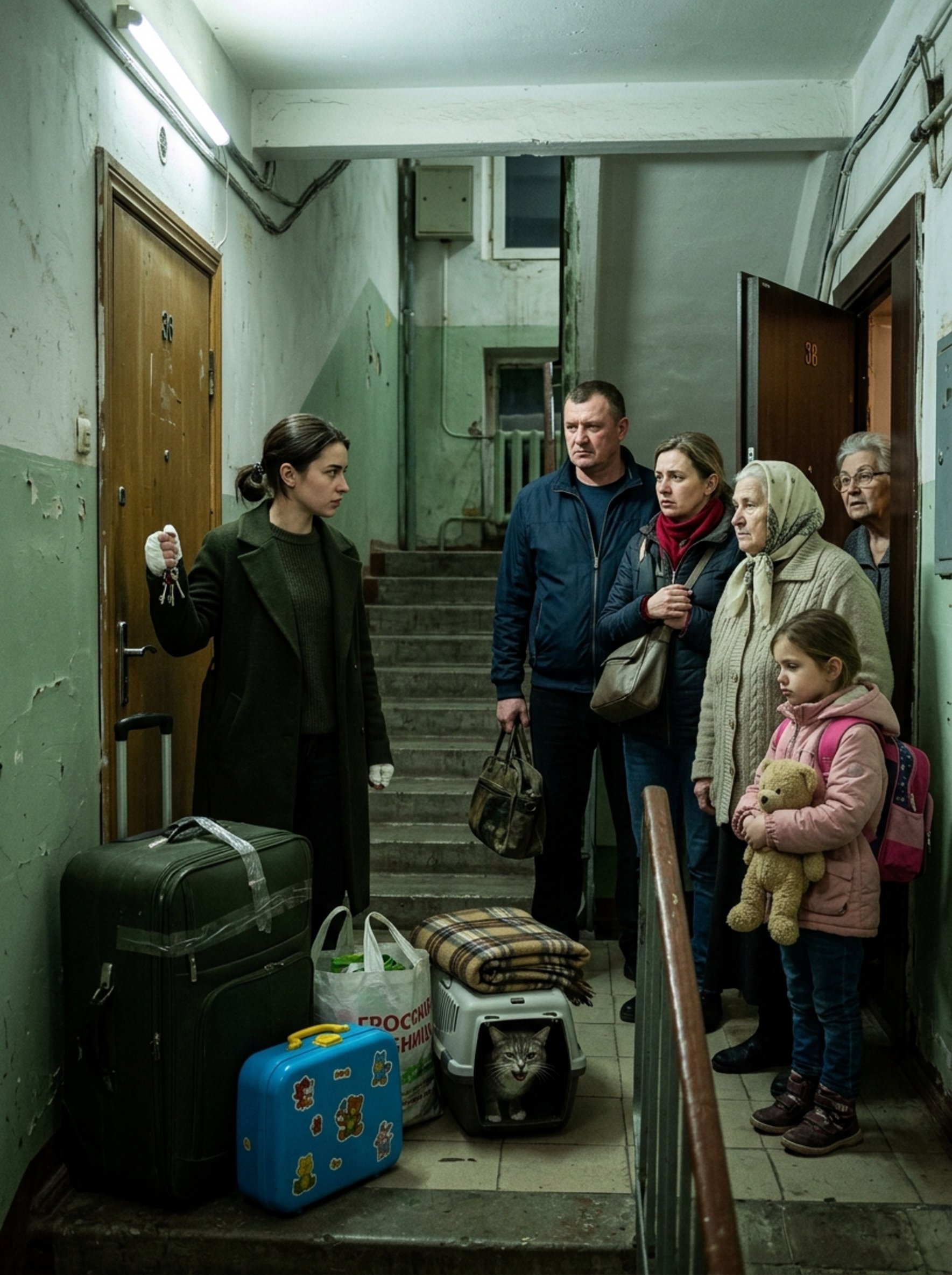 Их оказалось четыре: два внушительных, один потрёпанный, с оторванной ручкой, и небольшой ярко‑синий детский, облепленный наклейками. Рядом — пакеты из супермаркета, клетчатое одеяло, стянутое ремнём, и пластиковая переноска. Изнутри доносилось сердитое шипение.
