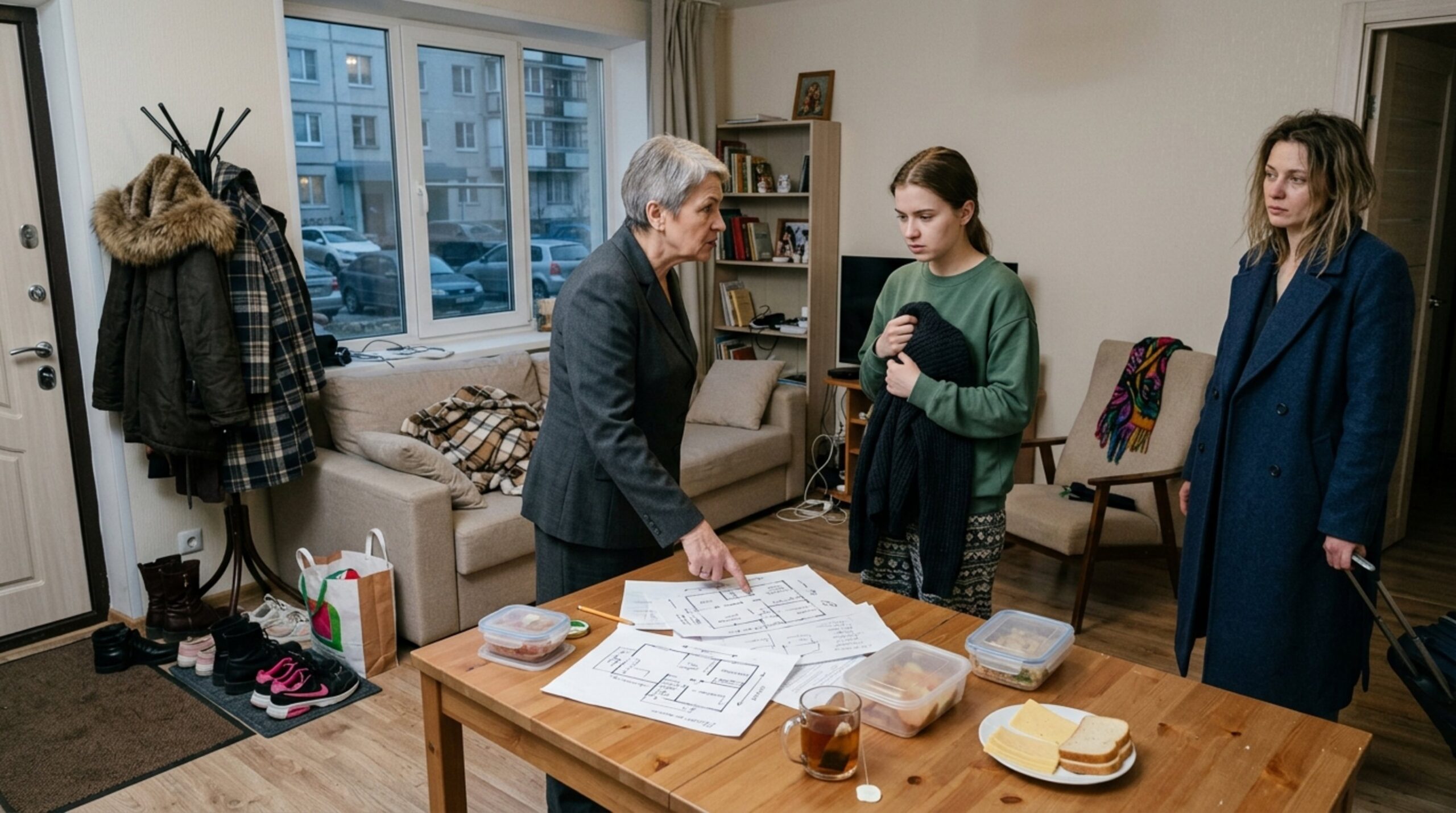 Свекровь в строгом сером костюме сидела на корточках, прижимая ладонью бумагу. Юлия, растрёпанная после дороги, в носках и свободной кофте, вытаскивала из сумки вещи и раскладывала их на диване: джинсы, несессер, зарядку, блокнот, прозрачную папку с документами.
