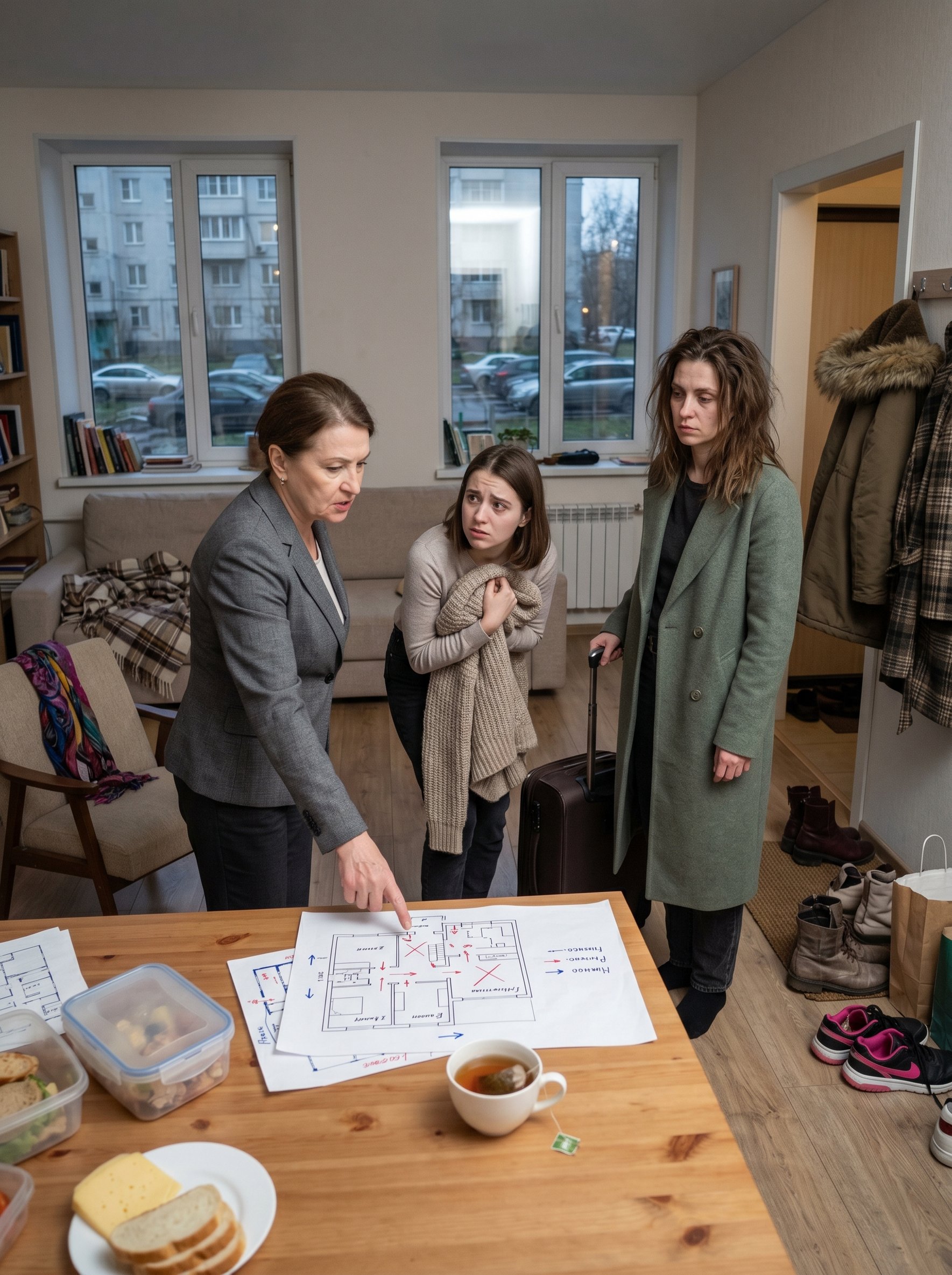 Гостиная была залита дневным светом. Стол, который она перед отъездом оставила пустым, теперь оказался заставлен чужими сумками, контейнерами с едой, косметичкой и свёрнутыми листами бумаги. На диване лежал раскрытый плед. На спинке кресла — яркий шарф. На журнальном столике — кружка с недопитым чаем и тарелка с нарезанным сыром и хлебом, словно хозяйки сделали перерыв между «делами».