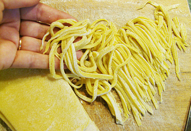 4. Перед нарезкой вы должны определиться, какого размера вы хотите лапшу: узкую или широкую, длинную или короткую. В соответствии со своими замыслами нарежьте тесто на лапшу.