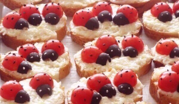 Затем начинайте украшать бутерброды. Черри разрежьте пополам, а маслину — на 4 части, несколько маслинок раскрошите в крошку. Потом на бутерброд положите помидоры и приставьте к ним головку (маслины). На тельце сделайте точки из покрошенных маслин, на голове нарисуйте глазки из майонеза с помощью зубочистки. Все, блюдо готово!