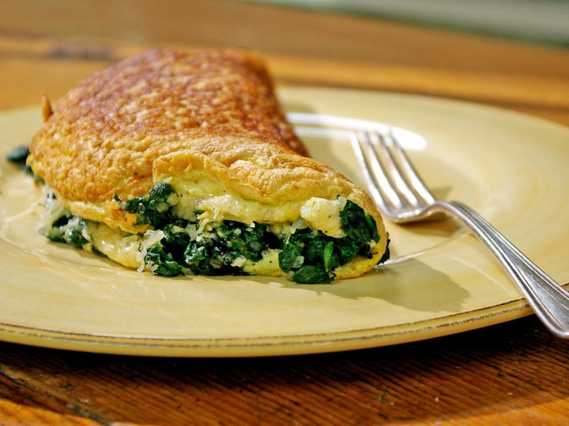 Отдельно взбить яйца, равномерно залить ими шпинат (если осталась вода — слить) в сковороде и не переворачивая довести омлет до готовности.