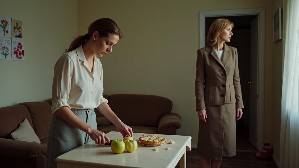 Тамара как раз нарезала яблоки для дочери, когда в дверь позвонили. Она не ожидала посетителей, но всё равно спокойно направилась открывать. На пороге стояла высокая женщина в элегантном пальто с цепкой, уверенной улыбкой.