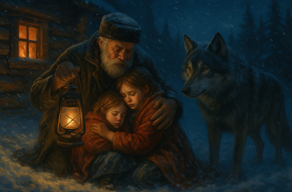 Он молчит, но слёзы катятся по его морщинистым щекам. В доме, где столько лет царило одиночество, впервые за долгое время звучит детский смех — робкий, сначала как скрип снега под лапой, но настоящий.