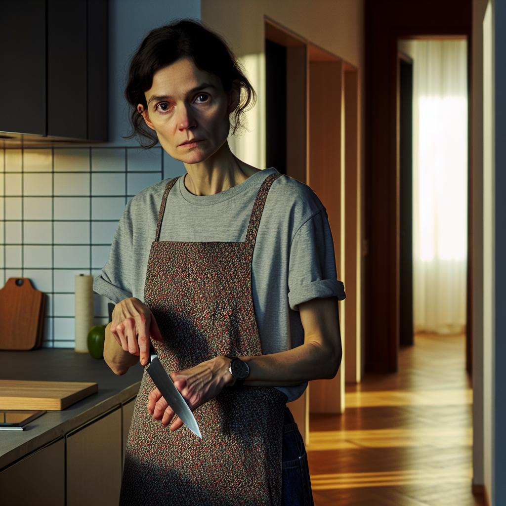 И почему у тебя такой странный вид? — Иди сюда, — он подошёл и забрал у жены нож, которым она резала колбасу.