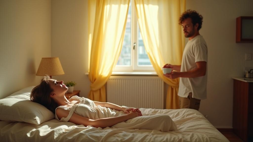 Он был одет в домашнюю футболку и старые трикотажные брюки; волосы слегка растрёпаны. — Доброе утро… — произнёс он тихо и поставил чашку на её тумбочку.