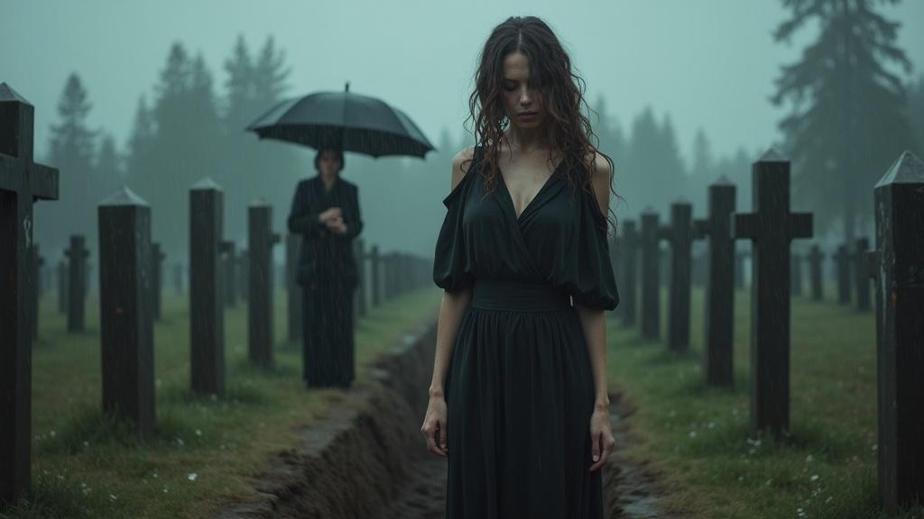 На её лице не было настоящей скорби. Лишь аккуратные движения рукой, стирающей слёзы из уголков глаз — как будто она играла роль на публику.