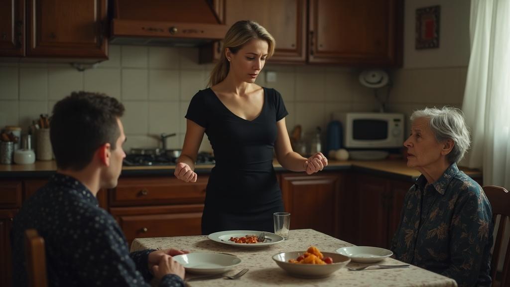 Атмосфера на кухне стала настолько напряжённой, что казалось — воздух можно было резать ножом. Семейный ужин окончательно превратился в арену для выяснения отношений.